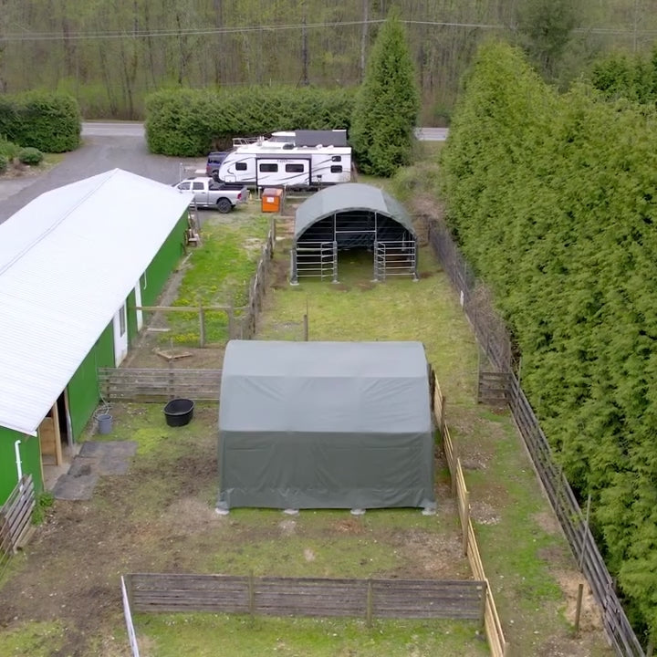 20’ x 20’ Livestock Corral Shelter, Powder Coated Structure, 12’ Dome Roof, 17 oz Military Green PVC Fabric Covering, 6-Bar Corral Panels, 5’ Front Swing Gate, TMG-ST2020L